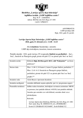| Description | Lektors: Kristi Boyce (UK) Ieskaites ST seminārs LSDF tiesnešiem, deju skolotājiem, treneriem un treneru asistentiem |