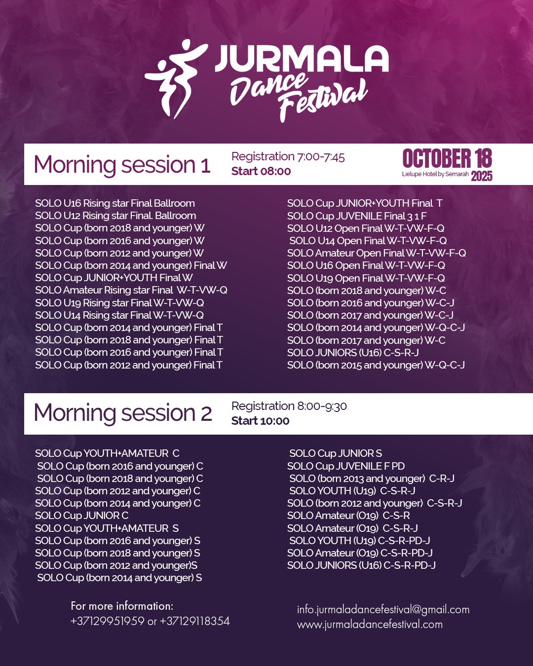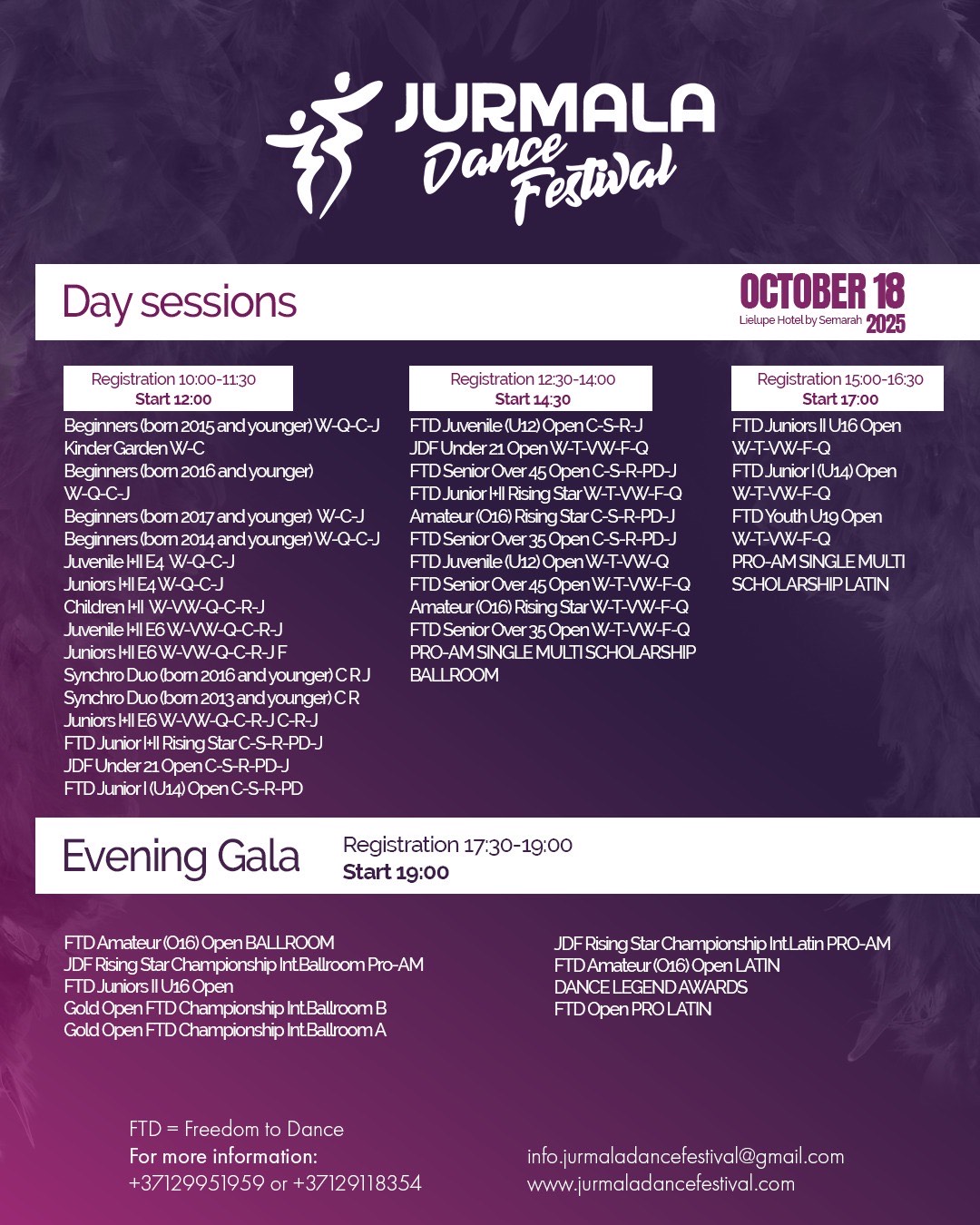 | Apraksts | Rīta daļa (morning part): • Ieejas maksa: 15 € • Dalības maksa (solo, duo, iesācēji): 15 € • Ieejas maksa: 20 € • Dalības maksa: 20 € Reģistrācija LSDF mājaslapā ir slēgta. Ja nokavēji reģistrāciju, vari to izdarīt šeit : https://flymark.com.ua/competition/proam/5721 |