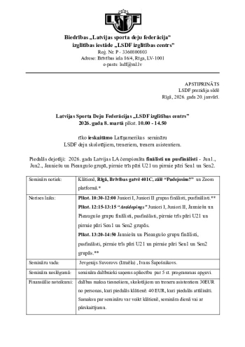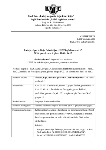 | Apraksts | Lektors: Jevgenijs Suvorovs (ISR) Ieskaites LA seminārs LSDF tiesnešiem, deju skolotājiem, treneriem un treneru asistentiem |